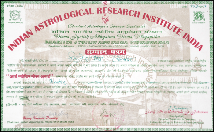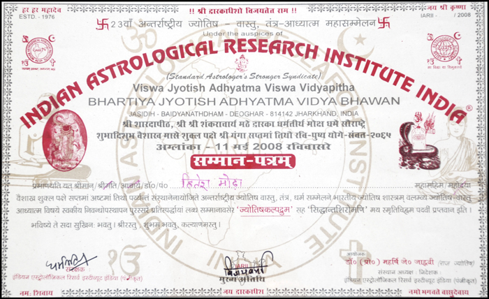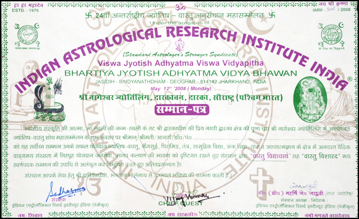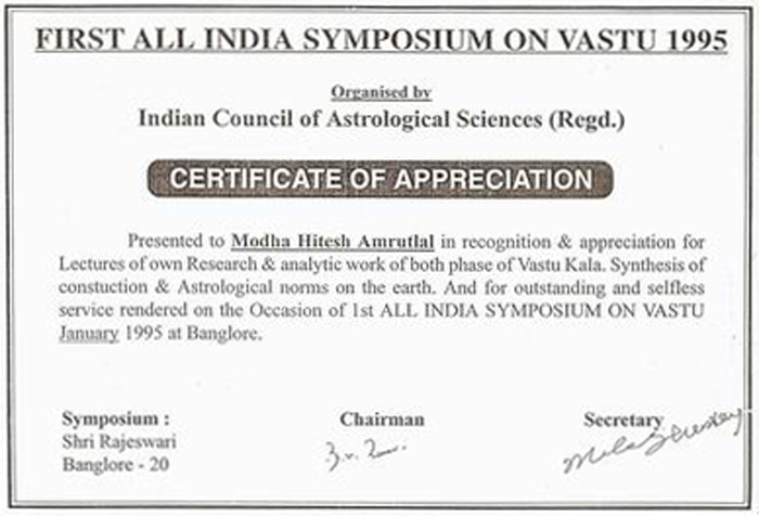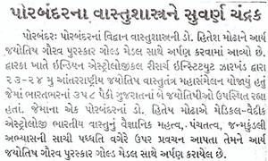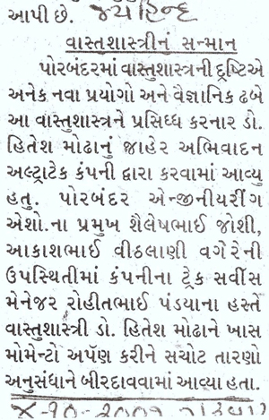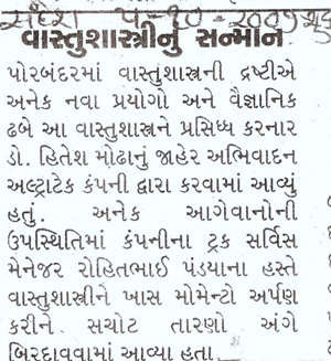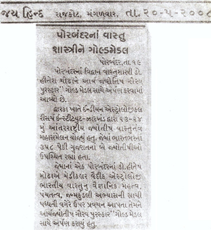 He is the only Gujarati to attain the FIRST ALL INDIA SYMPOSIUM ON VASTU 1995 which was organized by Indian Council of Astrological Sciences. A Gujarati magazine “ABHIYAN” has appreciated him in 1996. Since then during his medical practice he made many research on vastu science, astrology, Ayurveda, Homoeopathy, Vedic-shatdarshan and yoga etc. now he is the counselor and Vastu-astrologer for many industrial groups. He has studied more than 25,000 horoscopes. He has gone for vastu, scientific study of the houses and shops, shopping-centre, apartments. Bungalows, factories about 5000 in figure. He doesn’t believe in publicity, though we friends made him to apply his knowledge fully professionally. Then he started "ISHAN" ASTRO VASTU CONSULTUNCY at PORBANDAR, GUJARAT (India), in 2006. after his consultancy he has get two GOLD MEDAL In vedic-astrology and Vashtushashtra with two degrees, one of "Arya-Jyotish Gaurav Award", and other "Vastu-Vidhyacharya" at 12/13 may 2008 By INDIAN ASTROLOGICAL RESEARCH INSTITUTE INDIA. It is well honorable & biggest institute in India. for  Again Dr Hitesh Modha is first in Gujarat for two GOLD MEDAL AND TWO ACCADAMIC HONOUR WITH DEGREES. Now Dr.Hitesh Modha’s article on astrology n vastu publish in daily newspaper Jai-hind(it is leading newspaper in Saurashtra) and Akila evening newspaper. We didn’t find such good results of vastu and astrology by other then Dr MODHA.